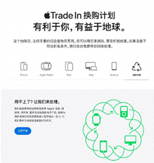 蘋果公司在其更新頁面上明確表示:“這個地球日,讓你手里的舊設備物盡其用。”該公司鼓勵用戶通過換購計劃,用手中的舊設備換取購置新設備時的折抵優惠。對于那些不符合折抵條件的設備,蘋果也提供了免費回收處理服務。