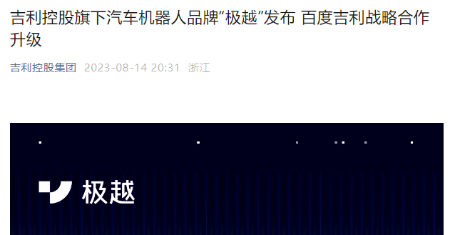 據了解,極越是吉利控股集團旗下的汽車機器人品牌。2023年8月14日,“極越”正式發布,首款車型命名為“極越01”,并于同年10月27日正式上市。2023年12月26日,極越宣布旗下定位“最美智能掀背轎車”的第二款量產車正式定名“極越07”,并計劃于次年上市。