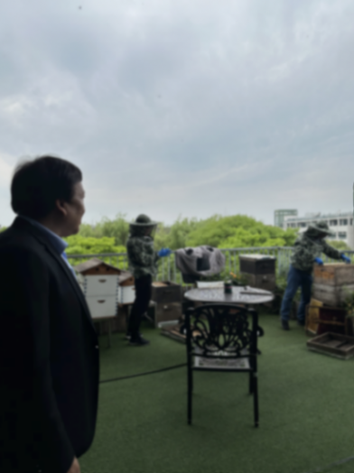 每周四下課的時候,胡福良總是小心翼翼收起蜂蜜罐子,再回到動物科學大樓的小路上。電梯抵達三樓時,研究室的一名老師和一名學生穿著迷彩防護服,正在露臺上將蜜蜂從一個蜂巢引至另一間蜂巢,胡福良說他們是“養蜂工作者”。