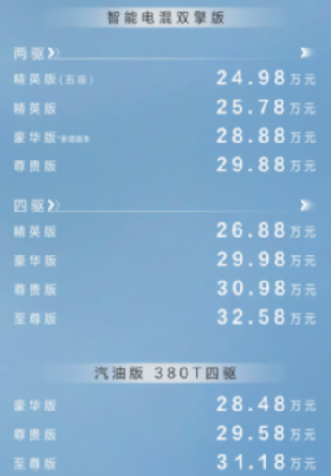 動力方面,2024 款漢蘭達提供 2.0T 燃油版,最大功率 182 千瓦,峰值扭矩 380 牛?米,匹配 8 擋手自一體變速箱,提供四驅版本;智能電混雙擎版提供 2.5 升油電混合動力,系統綜合最大功率為 181 千瓦,匹配 E-CVT 電子無級變速箱,同樣提供四驅版本。
