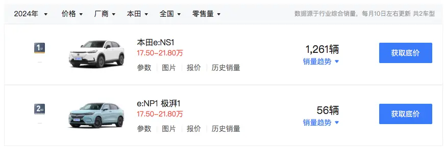 截至目前,e:N系列的兩款車型自上市以來銷量就毫無起色。零售數(shù)據(jù)顯示,今年1-2月,東風(fēng)本田e:NS1累計(jì)銷量為1,261輛,廣汽本田e:NP1為56輛。