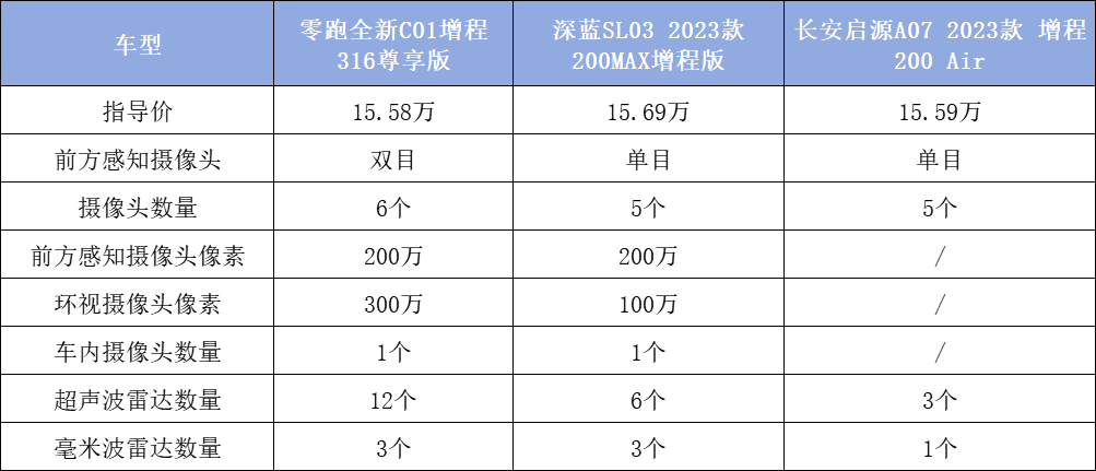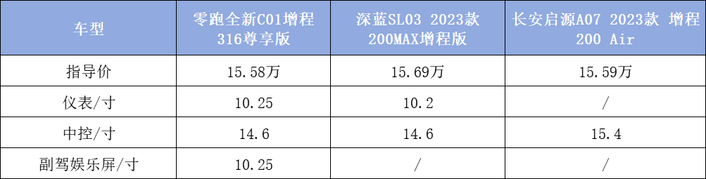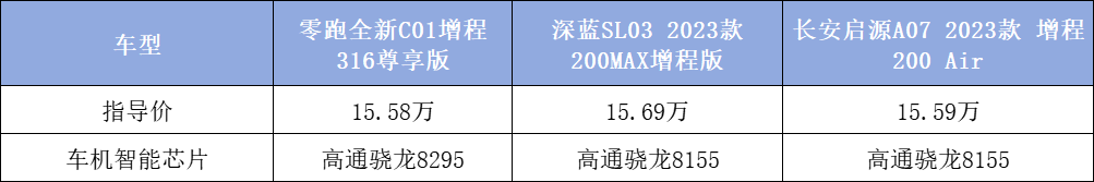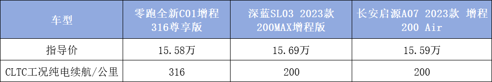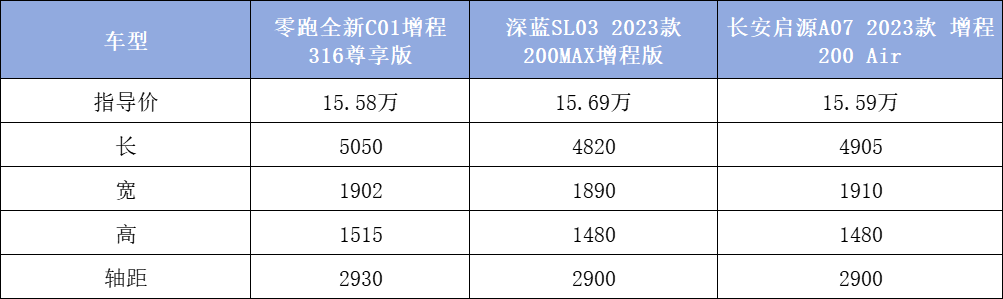 接下來,我們選擇價格相近的零跑全新C01增程 316尊享版(指導價:15.58萬,以下簡稱:零跑全新C01)、深藍SL03 2023款 200MAX增程版(指導價:15.69萬,以下簡稱:深藍SL03)、長安啟源A07 2023款 增程 200 Air(指導價:15.59萬,以下簡稱:長安啟源A07)三款車型進行對比,看一看,到底誰更值得我們選擇。
