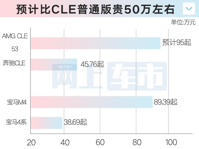 從梅賽德斯-AMG官方了解到,AMG CLE 53將于6月1日粵港澳大灣區車展上市。AMG CLE 53采用更運動的外觀、內飾設計,搭載3.0T+48V輕混動力系統,百公里加速在4秒左右。寶馬同級產品M4與普通版4系差價在50萬元左右,預計AMG CLE 53也將比CLE普通版貴50萬左右,售價或為95萬。