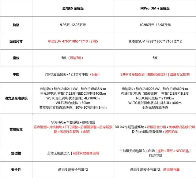 宋Pro配置也很高,綜合實力也很強,但凡事怕對比,跟同級合資SUV比,宋Pro性價比高,但跟價格更低的藍電E5榮耀版比,售價多了3萬元。