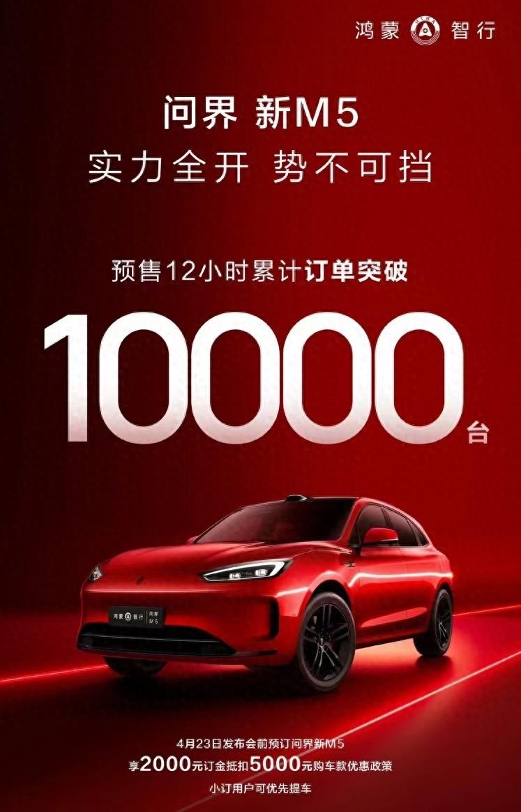 近日,根據鴻蒙智行官方數據,自4月17日上午開放預定通道后12小時,問界新M5累計訂單已經突破1萬臺。按照規劃,新車將于4月23日正式上市。在預售期間,用戶于發布會前預定,即可享受2000元定金抵扣5000元車款的優惠政策。