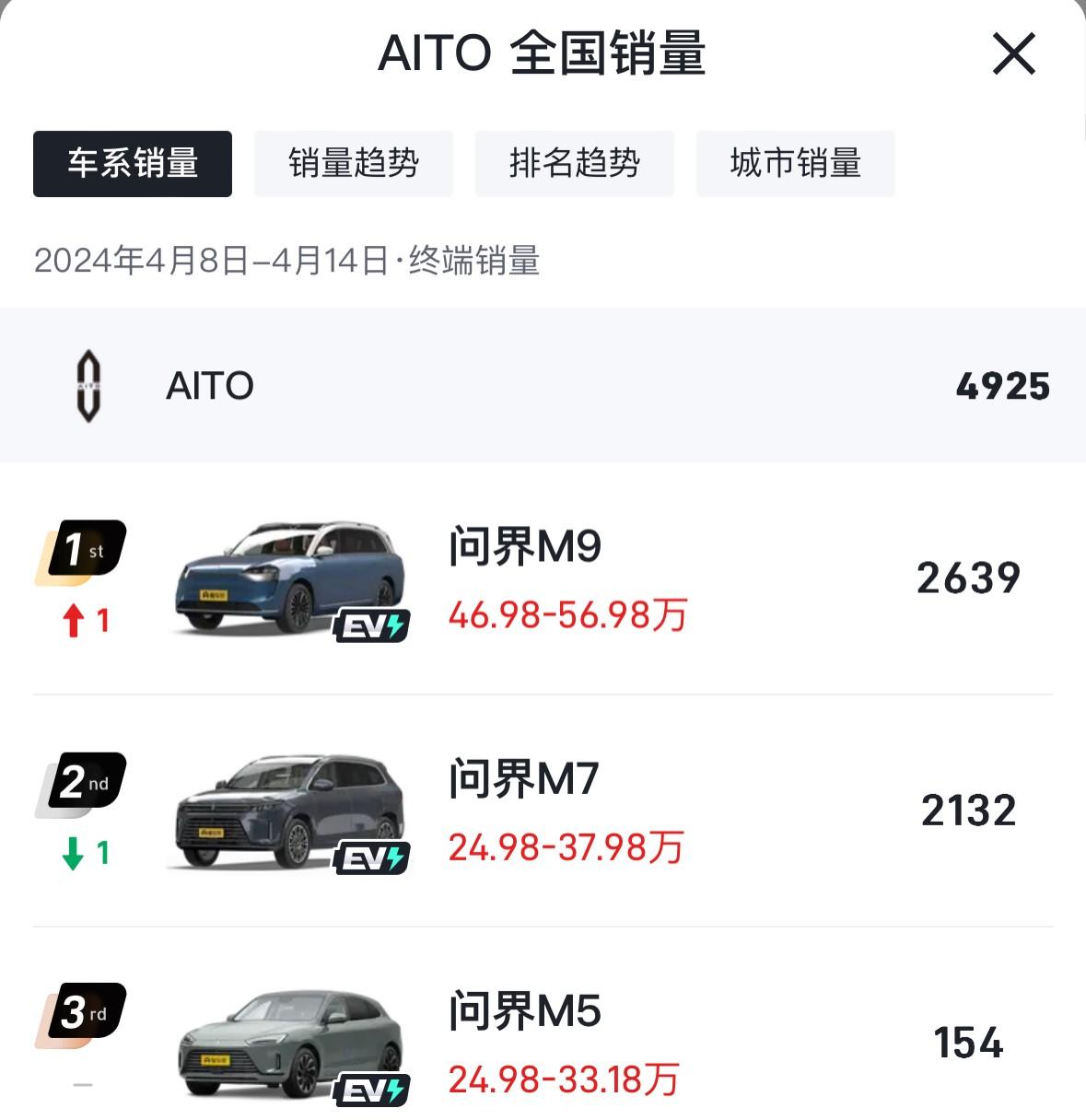 根據4月以來的周銷量數據顯示,AITO問界前兩周累計銷量為9125輛,理想已經連續兩周超過問界。其中在4月第二周(4月8日-4月14日),問界單周銷量為4925輛,其中問界M9的銷量已經超過問界新M7,而問界M5的銷量僅有154臺。
