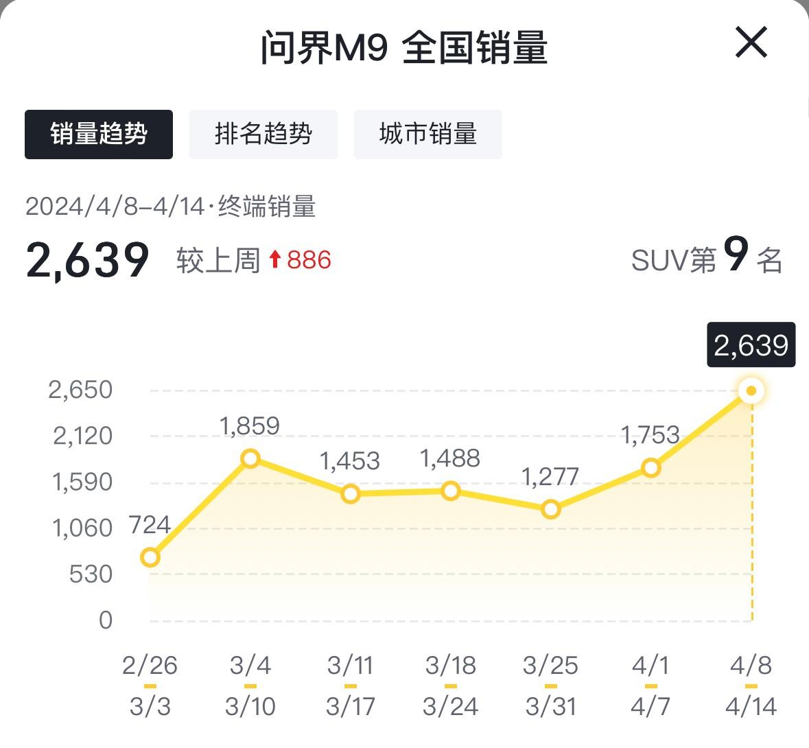 作為理想汽車的頭號競爭對手,問界的最新周度表現也值得關注。4月第二周的前十強榜單中,問界M9交付量達到2639臺,排名已經進入SUV市場前十。