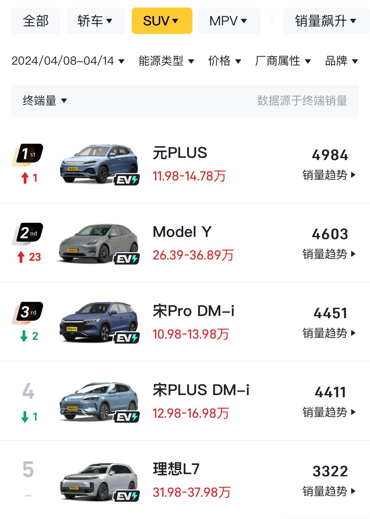 特斯拉也在第二周重回榜單,憑借4603輛的成績奪得銷量亞軍寶座。得益于23款理想L7加速清理庫存,理想L7第二周仍然穩居SUV第五,取得了3322輛的成績。據了解,目前23款L7 Air版本仍然還有部分庫存尚未清理。