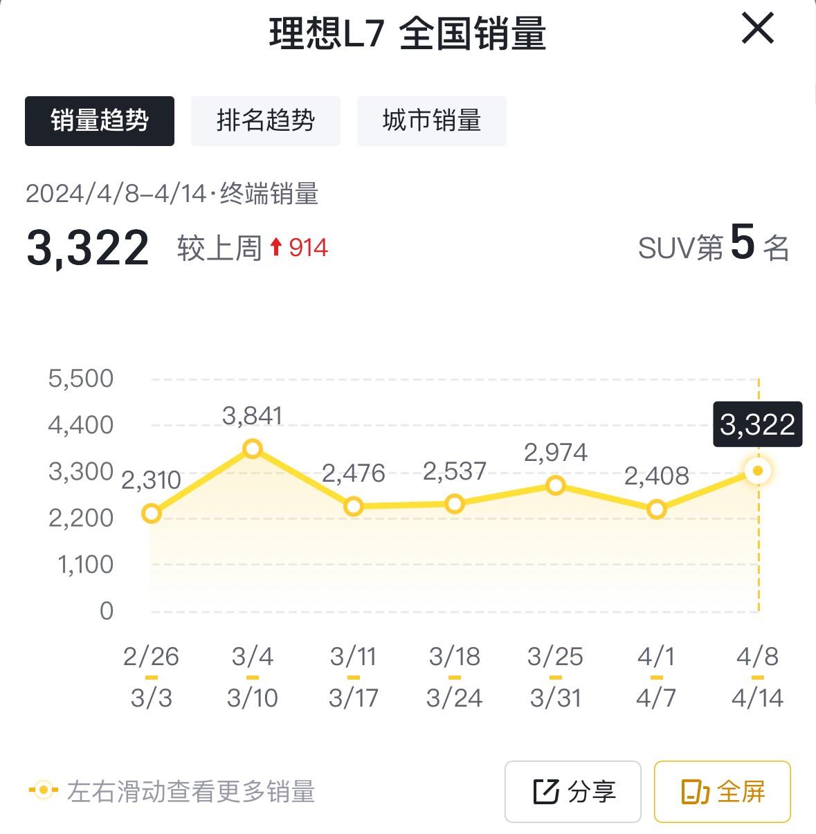 值得一提的是,4月18日,理想L6將迎來上市。受理想L6的影響,市場上部分L7的潛在客群購車目標已經逐漸轉移到了L6上,目前市場正處于觀望其最后定價的狀態。如果L6定價符合市場預期,上市即交付的L6有望成為理想汽車在SUV市場的又一明星車型。