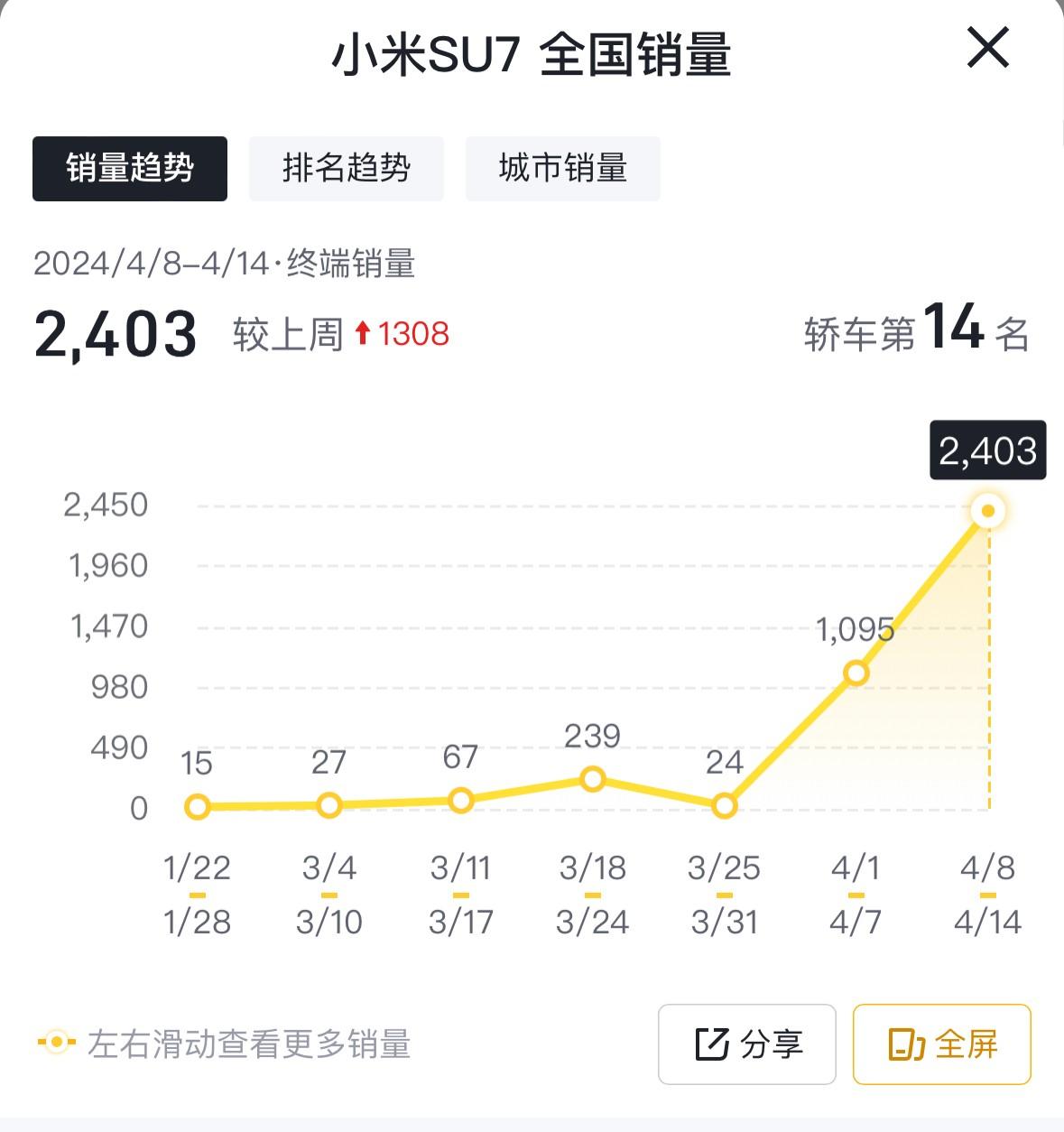 轎車市場中,最為可圈可點的車型還有小米SU7。4月第二周,小米SU7交付新車2403輛,相比第一周實現了翻倍增長。
