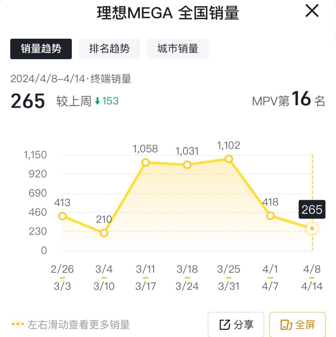 相比于上述車型,市場廣泛關注的理想MEGA在4月第二周,再次迎來了斷崖式下跌。第二周,理想MEGA銷量僅售出265臺。從理想MEGA自3月份上市以來的銷量軌跡不難發現,上市之初積累的大定基本已經完成轉化。接下來,理想MEGA銷量“低迷”或成常態。