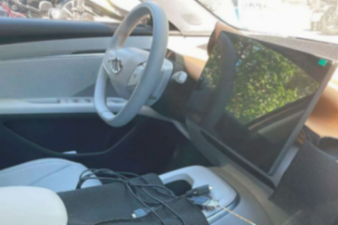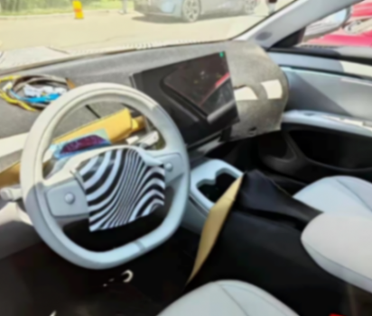 從諜照來看,整個內飾是類似特斯拉的極簡設計風格,車內除了方向盤上的兩顆滾球外基本沒有任何按鍵,最核心的元素為懸浮式大尺寸中控屏幕,左側沒有傳統儀表盤和HUD抬頭顯示,但方向盤柱上設有窄長條狀凸起,并貼有透明貼紙,可能是用作顯示續航里程、時速等信息的小屏幕。