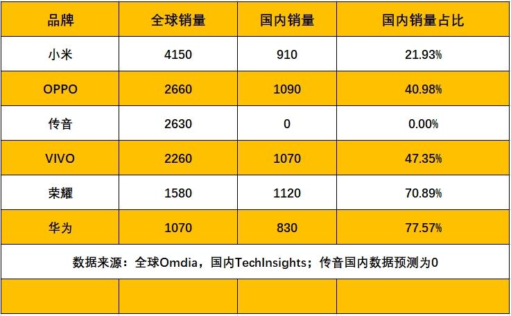 可以看到,國內銷量占比高的,在全球都排名不高,小米、OPPO、傳音國內銷量占比低,則進入了全不過前五名。