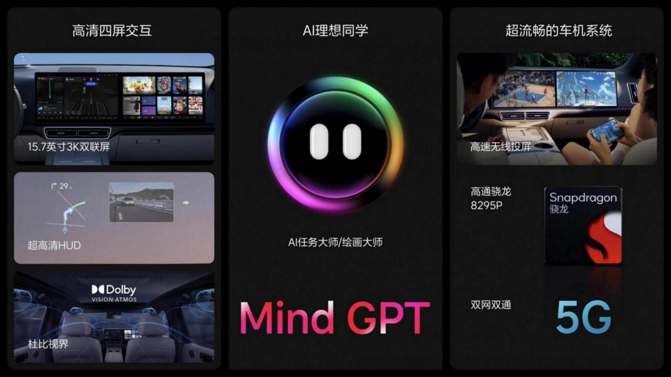 車身側面新車當然有著明顯的縮短,事實上更加運動一些,D柱傾斜角度更大,車頂面下墜顯得更加時尚,氣動輪轂也有著更為前衛的表現。在車尾部分,與L7主要是后保險杠細節差異以及牌照懸掛位置的不同,相似度其實要更高一些。在內飾部分新車前排與L7完全相同,不管是HUD抬頭顯示,獨特的方向盤儀表,副駕駛側雙娛樂屏15.7英寸3k分辨率,高通驍龍8295車機芯片,19揚聲器音響等元素。當然,新增了大模型Mind GPT功能的語音助手,也算是追趕了時下流行時尚。