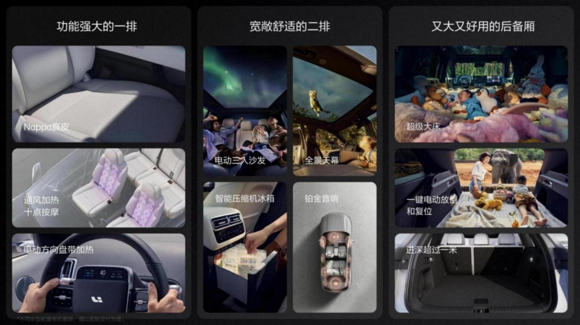 主要的不同在于后排和配置方面,首先是車內空間的當然會縮小,這沒有任何可說之處,畢竟車身尺寸小了很多,其次全系都沒有大彩電,選擇了一整塊全景天幕,再次就是低配車型也沒有電冰箱。這對于冰箱彩電大沙發新能源車三件套的倡導者,理想品牌推出一款新車少了其中的兩件,消費者還要考慮清楚。當然大沙發方面的配置一個都沒有少,各種通風加熱按摩,多種角度可調等元素都不會缺席,還是兜住了底線。而得益于實際上仍較大尺寸的車身,無論是乘坐空間表現還是后備箱空間方面都有著不錯的水平。
