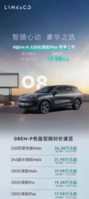 領克08 EM-P 120長續航Plus版上市,售價19.58萬,綜合續航超1200km