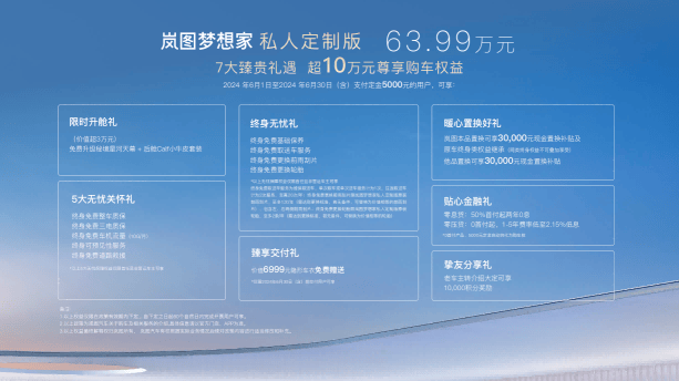 6月1日,嵐圖汽車(chē)宣布煥新升級(jí)而來(lái)的嵐圖FREE 318大灣區(qū)預(yù)售開(kāi)啟,預(yù)售期間下定的用戶(hù)可享包括訂金十倍膨脹禮等在內(nèi)的一系列專(zhuān)屬權(quán)益。此外,嵐圖夢(mèng)想家車(chē)主專(zhuān)屬高定平臺(tái)重磅新品“嵐圖夢(mèng)想家私人定制版”迎來(lái)發(fā)布上市,官方售價(jià)63.99萬(wàn)元,提供包括限時(shí)升艙禮、5大關(guān)懷禮、終身無(wú)憂禮、貼心金融禮、臻享交付禮、摯友分享禮等價(jià)值超10萬(wàn)元的限時(shí)權(quán)益,即日起,用戶(hù)可登陸嵐圖官方APP下定。