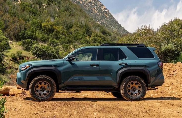 從車身側(cè)面來看,全新4Runner保留了經(jīng)典的硬派車身線條,車頂采用粗壯的行李架設(shè)計(jì),突出了輪拱和車門折線設(shè)計(jì)的立體感。車輛的離地間隙較高,搭配了高扁平比輪胎,同時(shí)車輛提供AT全地形輪胎可供選擇,越野性能相對好于標(biāo)準(zhǔn)版。和老款車型進(jìn)行對比,新車的軸距增加61毫米,并且車長增加119毫米,接近角和離去角各自為32度、24度。