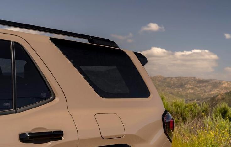 至于車尾,對稱式C型尾燈采用熏黑處理,方正的車尾線條和前后外擴(kuò)的輪拱設(shè)計(jì)讓人感受到了力量感。在細(xì)節(jié)上,新車還采用了斜置C 柱設(shè)計(jì),配合長懸設(shè)計(jì),以及銀色后保險(xiǎn)杠凹槽造型,展現(xiàn)出豐田硬派越野車的專屬風(fēng)格。此外,新車尾部還配備了可滑動(dòng)開啟電動(dòng)升降尾窗,日常使用方便拿取后備箱物品。