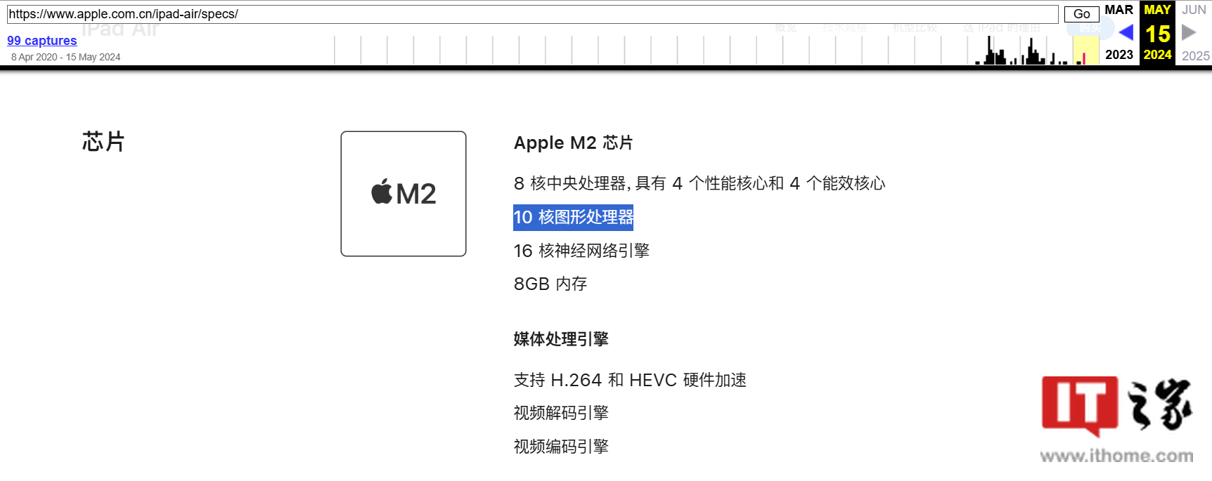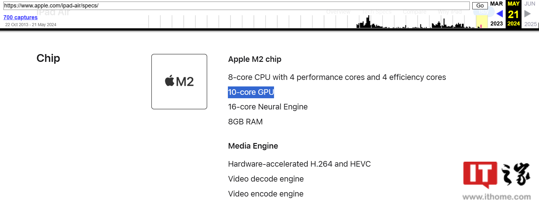 尚不清楚蘋果何時修改了官網(wǎng)的信息,目前蘋果官方新聞稿與部分地區(qū)官網(wǎng)仍標注新款 iPad Air 搭載 10 核 GPU。