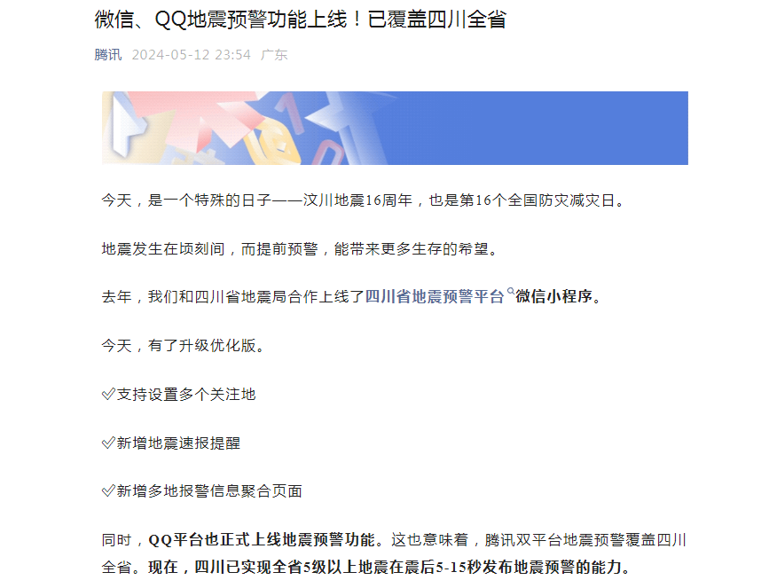5月12日,“ 騰訊 ” 微信公眾號(hào)發(fā)文稱(chēng),微信、QQ地震預(yù)警功能上線, 已實(shí)現(xiàn)四川省5級(jí)以上地震在震后5-15秒發(fā)布地震預(yù)警的能力。