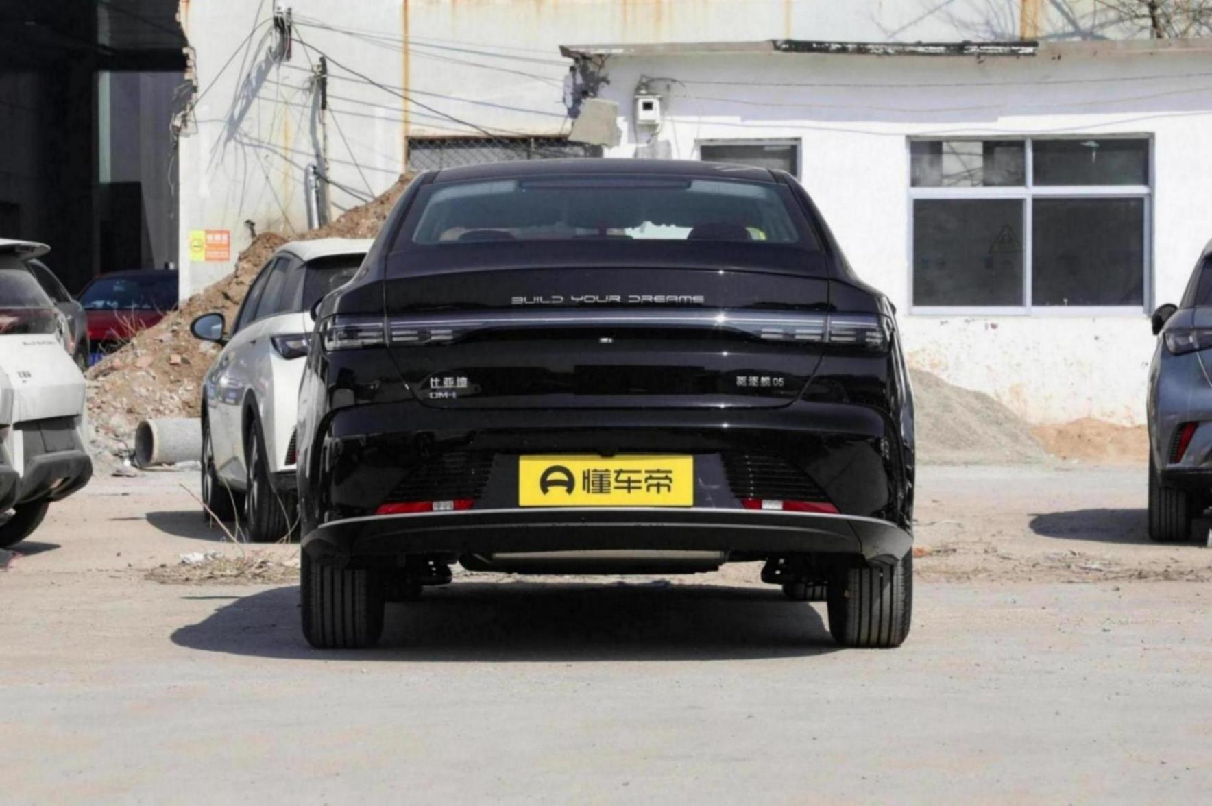 車尾部分,車尾中間位置使用了當下較為流行的貫穿式后尾燈,與前臉相呼應,值得一提的是燈罩并沒有使用常用的紅色設計,而是做了簡約樸素風格的黑白色。兩側的后導風口與前臉處保持統一,同時在尾燈中間位置,設計了比亞迪 build your dream字母標識。
