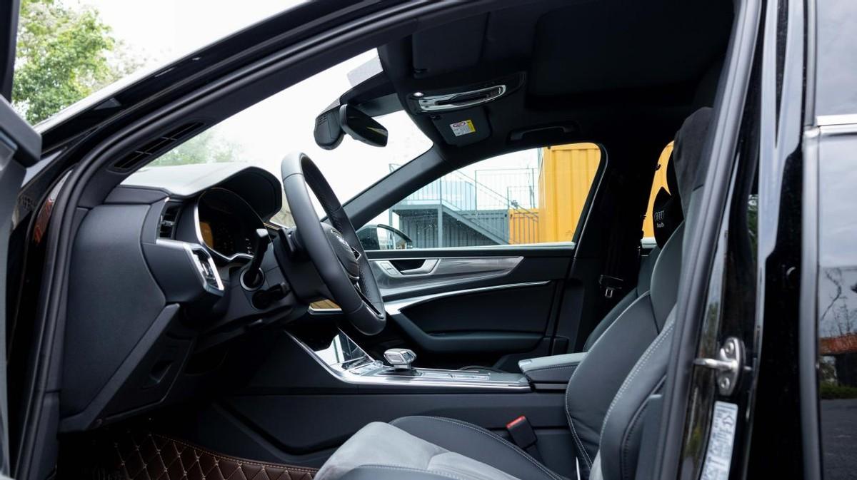 車身側面,奧迪A6L的線條很修長,兩段式腰線提升了車側的立體感,并且其整體造型很穩重,配合我們此次試駕車型的黑色漆面,整車具有很強的商務氣息。值得一提的是,此次試駕的車型還選裝了20英寸的槍灰色輪轂,視覺效果會更霸氣。