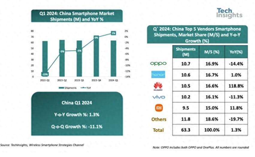 按照TechInsights的數(shù)據(jù)顯示,2024年一季度,華為手機(jī)銷量就超過1000萬臺,同比增長118.8%,穩(wěn)居國內(nèi)前第三名。