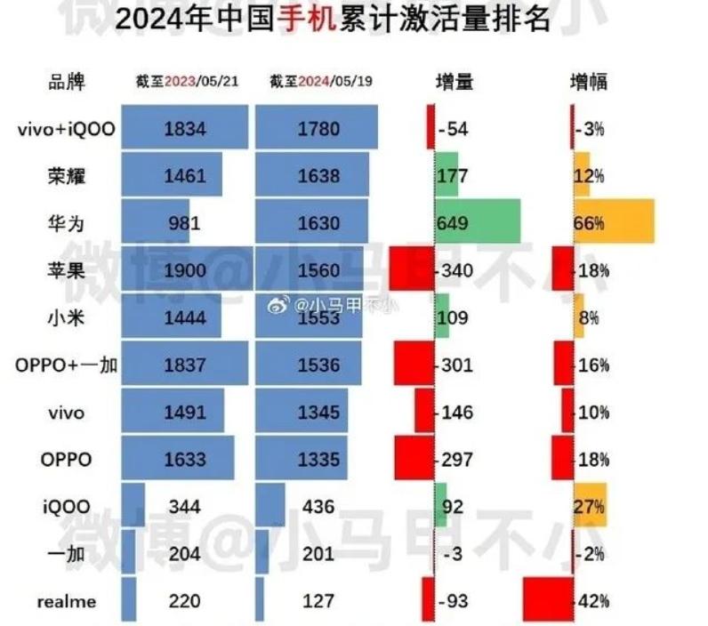 再看一份截止至5月19日的國內(nèi)累計激活量數(shù)據(jù),可以看到小米相比于去年,增量109萬臺,增長了8%,而蘋果、OPPO、VIVO、一加、realme都在下滑。