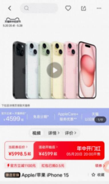 天貓Apple Store官方旗艦店顯示,5月20日起,疊加官方立減和天貓券后兩種促銷(xiāo)優(yōu)惠后,iPhone15優(yōu)惠1400元,售價(jià)4599元起;iPhone15Plus優(yōu)惠1400元,售價(jià)5599元起;iPhone15Pro優(yōu)惠1900元,售價(jià)6099元起;iPhone15Pro Max優(yōu)惠2050元,售價(jià)7949元起。