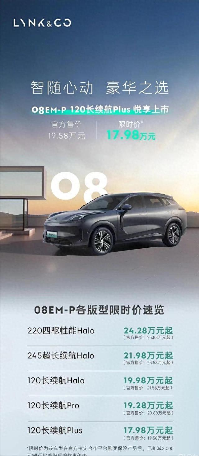近期,領克品牌宣布旗下新能源車型領克08 EM-P 120長續航Plus版正式上市,并同步推出了限時購車優惠政策,起售價調整為17.98萬元,相比原價19.58萬元,通過特定優惠活動可節省近1.6萬元。