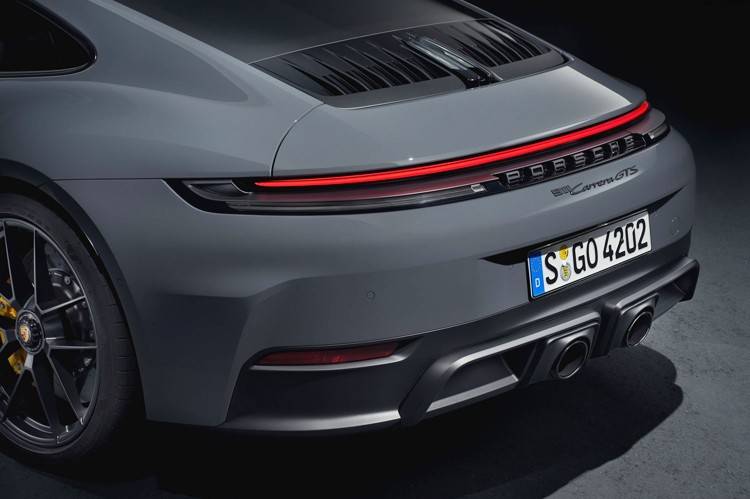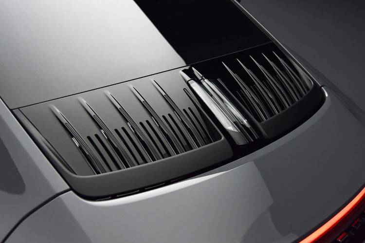 全新911車尾的所有細(xì)節(jié)基本都有變化,我們從上到下來(lái)看。首先是911車型最經(jīng)典的“百葉窗”換裝了新的設(shè)計(jì),由現(xiàn)款的一個(gè)整體改為了左右兩邊分體式設(shè)計(jì),并且長(zhǎng)度也更長(zhǎng)了,整體精致了很多。貫穿式尾燈的輪廓變得更加簡(jiǎn)潔,并取消了現(xiàn)款額外突出的部位,全部整合到了一個(gè)寬條里,所以保時(shí)捷的外文名稱標(biāo)識(shí)的細(xì)節(jié)也隨之發(fā)生了改變。最后是運(yùn)動(dòng)尾排改為了中置雙出,并且車牌框的位置也有小幅度的上移。