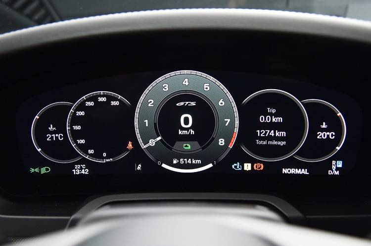 方向盤的碳紋比老款要更細(xì),下方的Sport Response按鈕也變成了更加醒目的紅色。儀表盤換裝了12.6英寸的液晶儀表,目前保時(shí)捷旗下的車型就剩下Macan燃油版與718還是機(jī)械儀表了。
