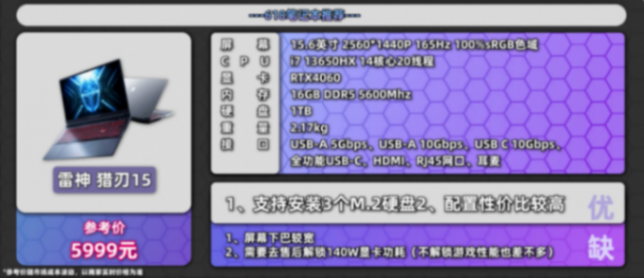 本次推薦的第一款很適合追求性價(jià)比的同學(xué),6000 元以內(nèi)就能買到 i7 13650HX+RTX4060,還有 3 個(gè) M.2 硬盤位,實(shí)用性拉滿,雖然這款是公模,但外觀也還可以。