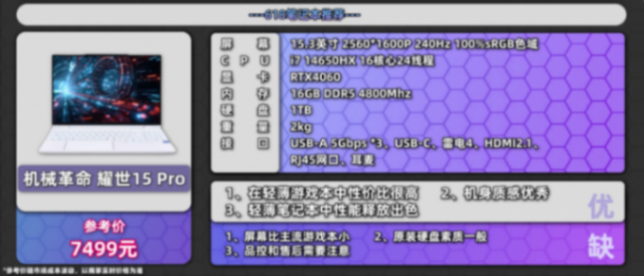 最后要推薦的是機(jī)械革命耀世 15Pro,這是一款輕薄型游戲本,重量只有 2Kg,機(jī)身體積也更小,屏幕縮小到了 15.3 英寸,而且散熱并沒有縮水,可以達(dá)到 180W 的整機(jī)性能釋放,達(dá)到主流游戲本的水平。