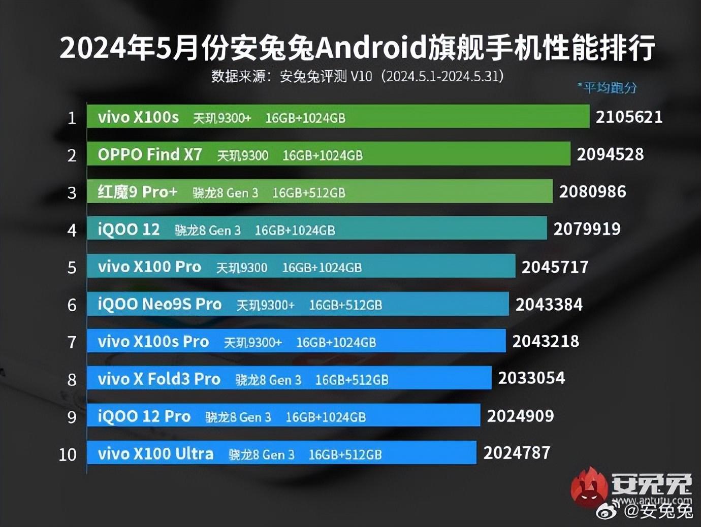 第一名是vivo X100s,得分是2105621,采用天璣9300處理器,第二名是OPPO Find X7,同樣也是天璣9300處理器,得分2094528,第三名是紅魔9 Pro+,采用高通驍龍8 Gen3處理器,得分2080986.