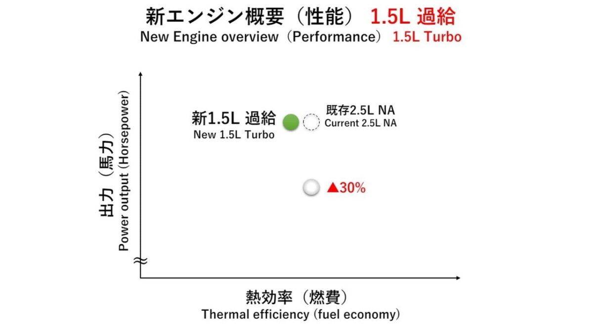 第二具正在開(kāi)發(fā)中的引擎是一臺(tái)1.5升渦輪增壓引擎。 它的體積比目前使用的2.5升自然進(jìn)氣引擎減少了20%,高度則降低了15%。 這款引擎的動(dòng)力將大致相同,但效率提升了約30%。