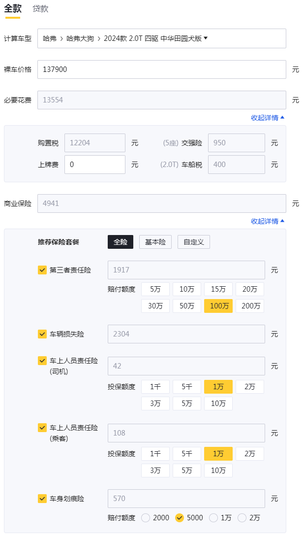 一般在購買完汽車后,還需要購買汽車保險,這樣在車輛有所損傷以及意外事故時,一定程度上能減少車主的損失。我們以官方指導價為14.99萬元的哈弗大狗為基礎來計算保險費用,目前部分地區有著1.2萬元的優惠幅度,優惠后的價格為13.79萬元(不同地區優惠幅度不一樣,以實際為主),交強險和車船稅分別為950元以及400元,商業險當中的第三者責任險按100萬來計算,再加上車輛損失險(含不計免賠),首年的保險費用在6291元左右(不同保險公司報價不一樣,以實際為準)。