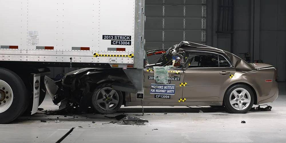作為全球標準最為嚴格的碰撞測試,美國IIHS(美國公路安全保險協會)在很久以前就已經有專門的針對大型車后部防撞欄的碰撞測試。當卡車后部設置有規范的防撞裝置時,后方的轎車在時速56km/h且呈30%偏置的情況下撞擊卡車的尾部,車輛的乘員艙整體保持完整,乘員也能得到有效的保護。