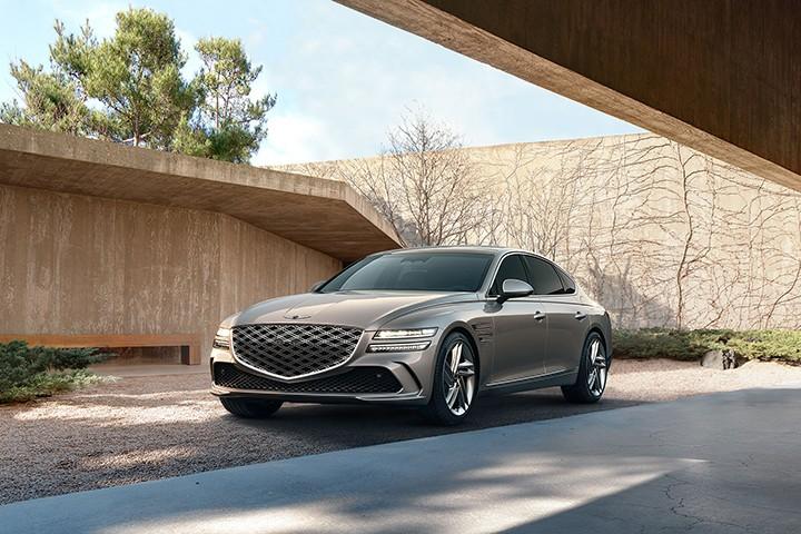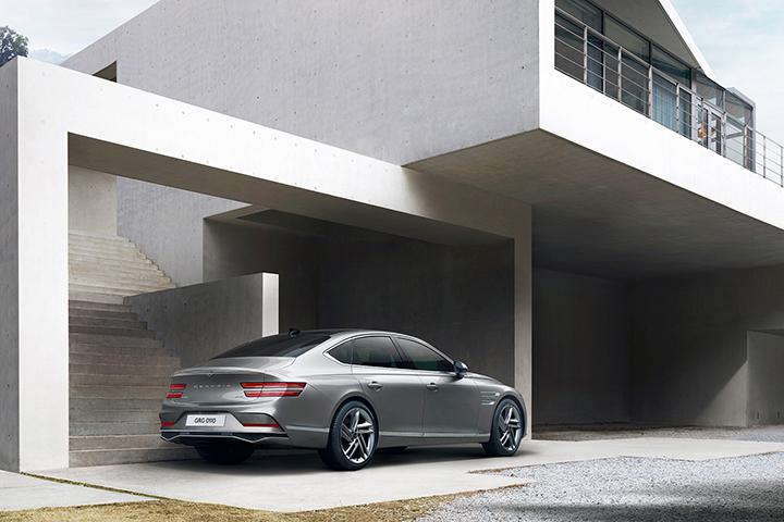 兩側燈組同樣保持著捷尼賽思品牌標志性的分體式大燈造型,上下兩段平行式的燈組以及內部精致的發光單元看著就非常上檔次,而且為了強化前臉運動感,新車還在包圍區域設計有獠牙狀導流槽的造型,行政轎車也有競技感可言。