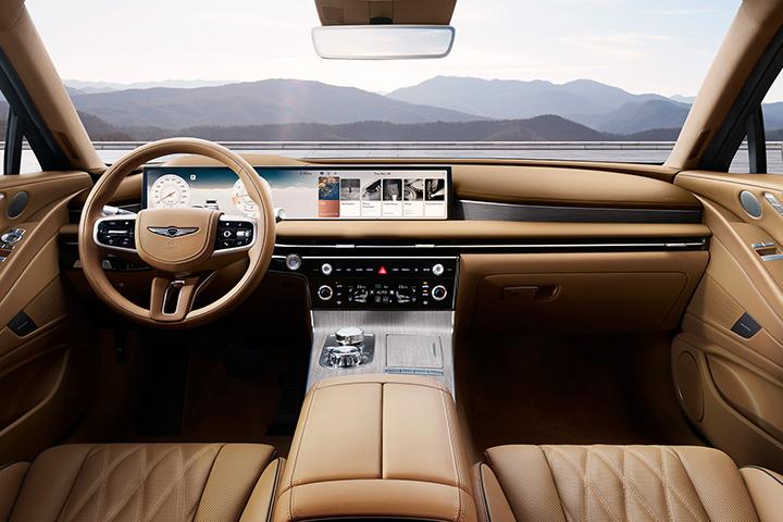 相比略帶運動屬性的外觀造型,新款捷尼賽思G80座艙展現出十足的豪華氣息,中控臺采用了環抱式處理,門板與中控臺銜接的區域通過上揚的線條進行過渡,有點進到豪華游艇內的感覺。