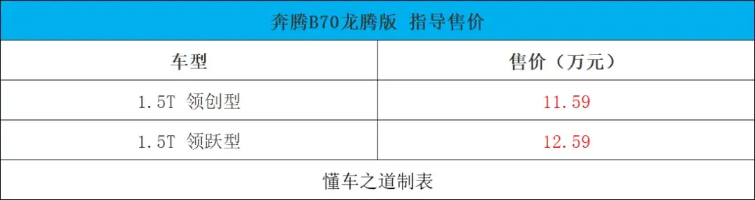 4月15日,我們從官方獲悉,奔騰B70龍騰版正式上市。新車共推出兩款車型(領創(chuàng)型/領躍型),售價分別為11.59萬元和12.59萬元。該車外觀與內飾均采用奔騰最新家族化設計語言, 動力方面,與目前在售兩款車型所搭載的2.0T+6AT的動力總成不同,龍騰版車型將搭載1.5T渦輪增壓四缸發(fā)動機,可輸出最大功率124kW,峰值扭矩258N·m,并匹配7速濕式雙離合變速箱,WLTC綜合油耗為6.8L/100km。