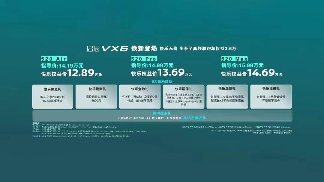 新款啟辰VX6共推出3款車型,其中2024款 520 Air的指導價格為14.19萬元,2024款 520 Pro的指導價格為14.99萬元,2024款 520 Max的指導價格為15.99萬元,指導價格和2023款車型保持一致,而新款啟辰VX6上市便給出來了優惠政策,“快樂權益價”分別是12.89萬元、13.69萬元、14.69萬元。