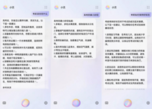 此外小藝也是幫助考生和家長(zhǎng)輕松備考的好幫手,例如詢(xún)問(wèn)“小藝,高考前感到焦慮怎么調(diào)整狀態(tài)?”小藝會(huì)快速提供建議,幫助考生調(diào)整心態(tài)。家長(zhǎng)們也能通過(guò)小藝獲取備考建議,如“高考前家長(zhǎng)可以做什么?”或“考生的營(yíng)養(yǎng)餐怎么做?”此外,還可以問(wèn)一些趣味性問(wèn)題,如“高考為什么選擇6月7號(hào)和8號(hào)?”以緩解緊張氛圍。