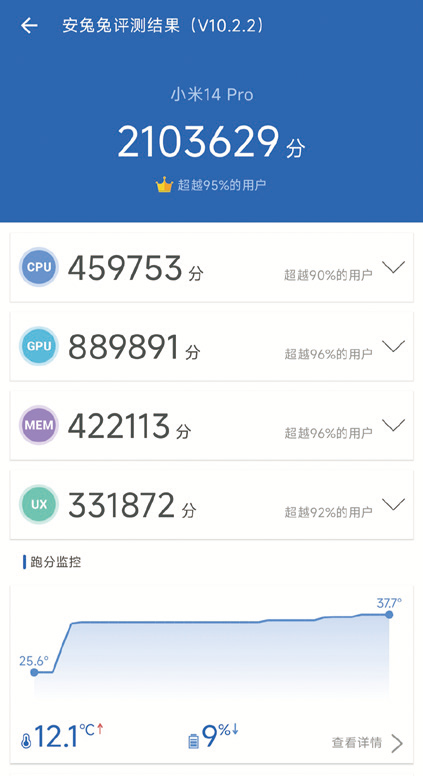 ▲《安兔兔評測》中小米14 Pro獲得2102629分