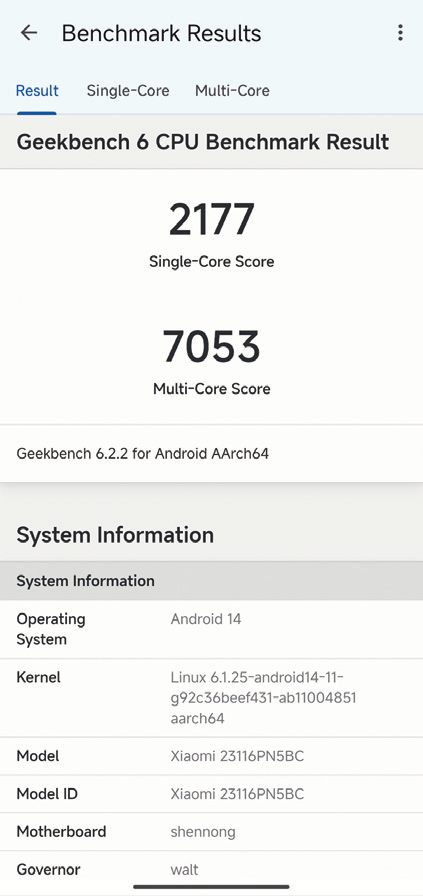 ▲Geekbench 6中小米14 Pro單核成績為2177分,雙核成績為7053分。
