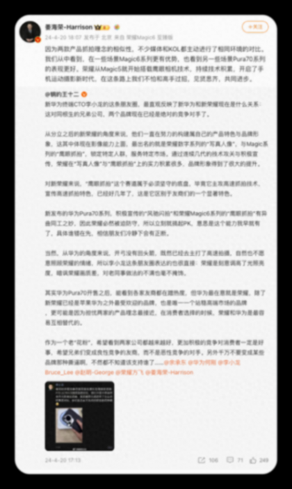 榮耀中國區(qū)CMO姜海榮則發(fā)微博表示,Magic 6系列與Pura 70系列在不同場景分別具有優(yōu)勢,表現(xiàn)互有勝負(fù),兩款產(chǎn)品抓拍的理念也具有相似性。