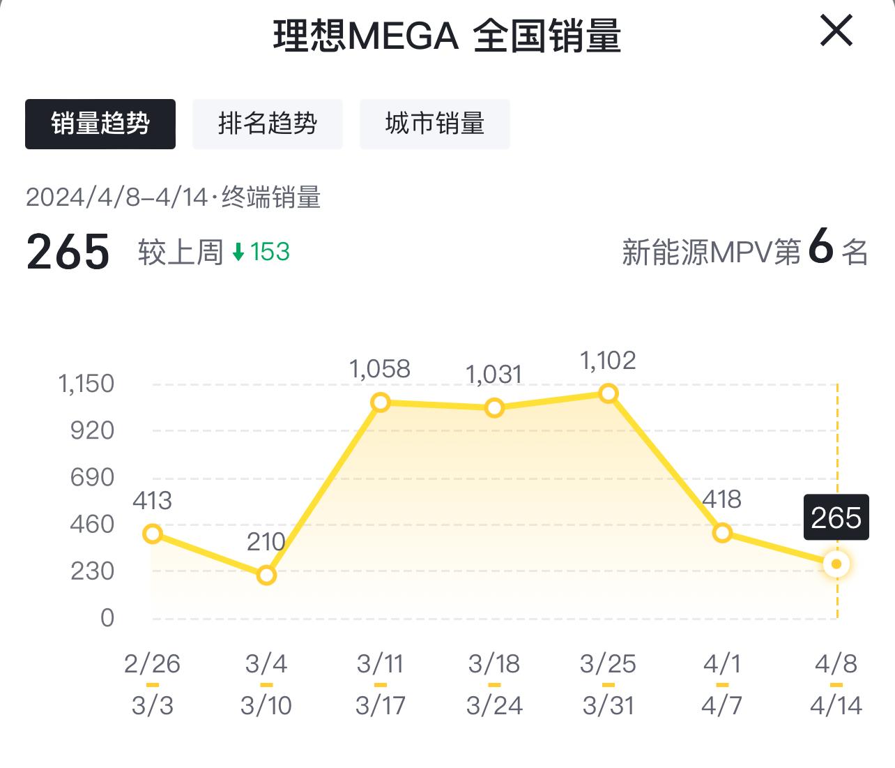 而上市不到兩個月的理想MEGA,則直接降價30000元,銷量數(shù)據(jù)顯示,理想MEGA在3月份的銷量為3229輛,而這還是交付初期有上市訂單的情況下,4月份的前兩周,理想MEGA的周銷量分別為418臺和265臺。