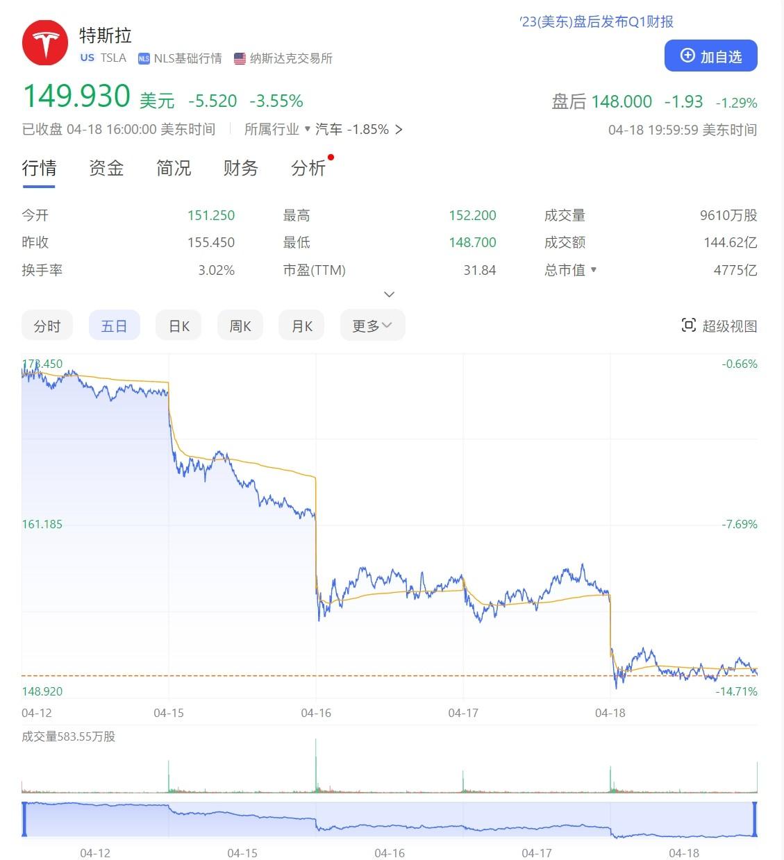 4月19日凌晨,截至美股收盤,特斯拉跌3.55%,報149.93美元,刷新15個月以來股價新低。與此同時,這已經是特斯拉股價連續5個交易日下滑,累計跌幅高達15%,累計市值蒸發786億元,換算成人民幣高達5689.6億元。