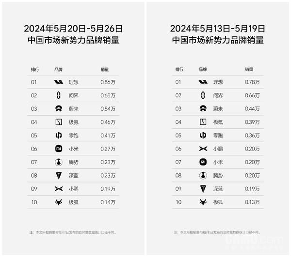 此外,近三周以來,新勢力品牌周銷量排名前三的均依次為理想、問界和蔚來。最新一周(5.27-6.2),排名前十的新勢力車企分別為理想、問界、蔚來、零跑、極氪、深藍、小鵬、騰勢、小米和極狐。本周小米排名第9,周銷量達0.22萬輛。小米正在持續產能爬坡。